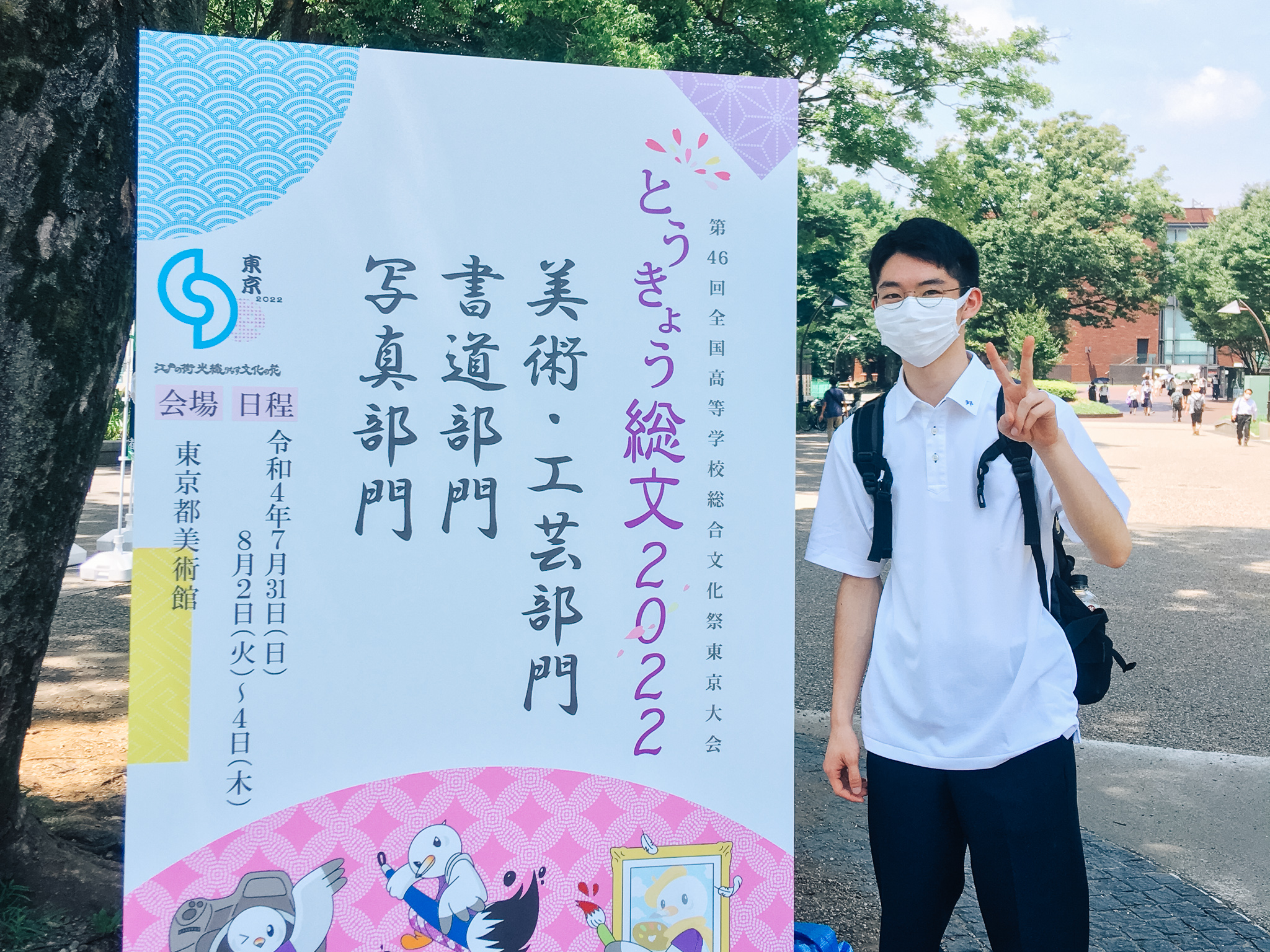 8月1日〜3日に東京都美術館(台東区)、かつしかシンフォニーヒルズ(葛飾区)で開催されたとうきょう総文2022 第46回全国高等学校総合文化祭東京大会書道部門において、2022年度高文連全道大会で道内1500名の代表として推薦、選抜された17名の1人として、本校3年生の西野君が総文祭書道部門に参加し、全道から集まった仲間と3日間の貴重な体験をしました。「今回の総文祭には文字に変化をつけたり、個性を出したりして、「高校生らしさ」や「自分らしさ」を楽しんで表現している作品が多くありました。一つ一つの作品に個性があり、その違いが書の楽しさを生み出しているのではないかと講評を聞いて感じました。講評集で私の作品には、『言葉と文字を効果的に表現するため、重厚な線質に潤渇の変化を工夫した作品』と書かれていました。自分の意図していたことが評価され、とても嬉しかったです。この総文祭を通して、同じ書道を学ぶ仲間と出会えたり、様々な表現や考え方に触れることが出来て本当に良かったです。これからも自分らしさを大切に書道を楽しんでいきたいです。」西野君。