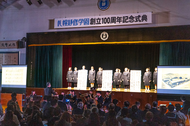 10月21日(金)本校体育館にて創立100周年記念式典が行われました。三部構成の式典ではノンフィクション作家の梯久美子様をお招きし、「歴史を知る、今を生きる」をテーマに講演をしていただきました。また、第三部では記念公演「静修100年」(脚本・演出本校非常勤講師 漆崎隆)が演劇部、合唱部、合唱有志、吹奏楽部、書道部、美術部、放送局の生徒たちの出演・協力で上演され、100年の歴史を校舎で振り返り感動もひとしおでした。