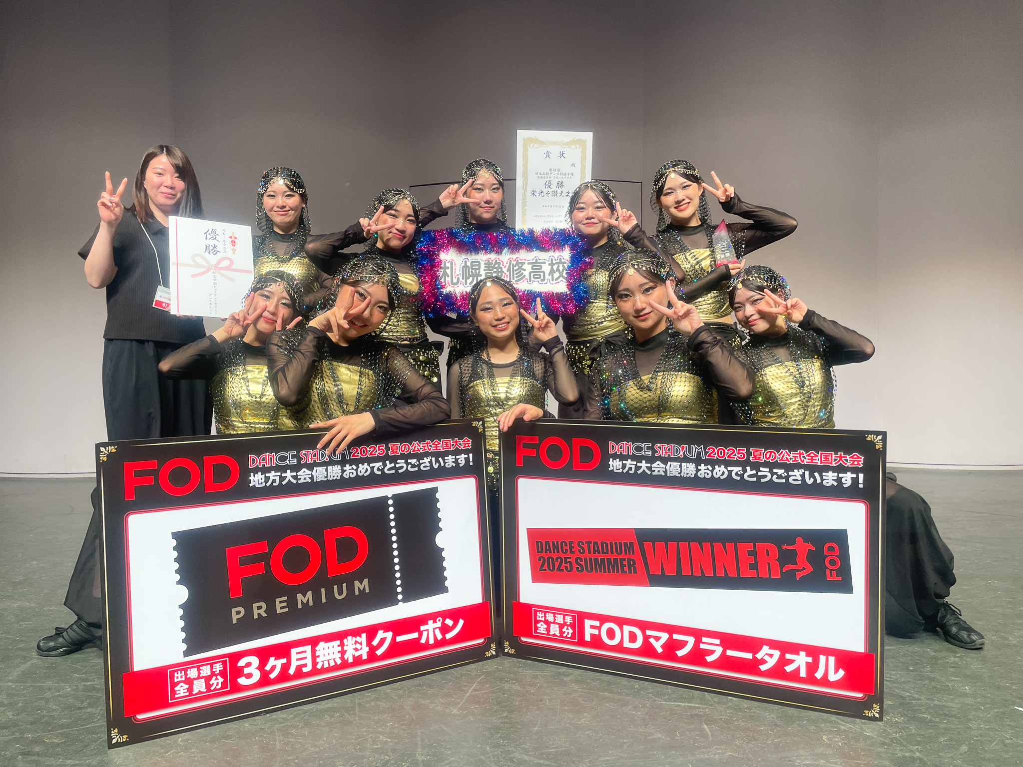 7月25日(金)、札幌共済ホールで第18回日本高校ダンス部選手権 夏の公式全国大会通称ダンススタジアムの北海道大会が行われ、スモールクラス(人数編成2名~12名)に出場したダンス部が優勝しました。「半年以上かけて仕上げてきたダンスを、悔いなく披露することができました。4月の顧問就任以来、生徒たちには「応援されるチーム、味方を増やす行動」を意識するよう指導してきました。北海道代表として恥じない表現を、全国大会でも精一杯披露してまいります。」顧問の二木談。大会開催にご尽力いただいた大会関係者・運営の皆様、対戦していただいたチームの皆様、日頃よりご支援いただいている関係者の皆様、ありがとうございました。※8月19日(火)~20日(水)、パシフィコ横浜国立大ホールで行われる第18回日本高校ダンス部選手権に北海道代表として出場します。応援よろしくお願いします。
