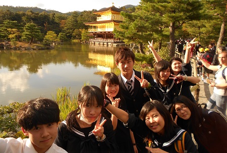 待ちに待った修学旅行。16日(木)、台風一過の晴れ渡った秋晴れの中、広島へ向けて出発しました。爽やかな風が吹く中、フェリーでのクルージングを楽しみ、世界遺産の宮島・厳島神社の見学、参拝をしました。17日(金)には平和記念公園の原爆ドームを訪れ、被爆者の方から講話をいただきました。原爆投下から69年、平和への願いを込めて皆で折った千羽鶴を献納しました。この日、広島から京都へ向かい、最終見学地の金閣寺を散策しました。18日(土)は、京都市内の自主研修。沿道には、古都・京都の風情を感じるお土産屋さんが軒を連ねていました。