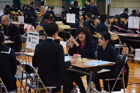 12月14日(金)、本校体育館にて2学年の進路支援イベントの一環で、なりたい職業・学問発見フェアを開催しました。今回は大学・短大・専門学校に協力いただき、「医療」「工業」「福祉・教育」「ビジネス」「文化・教養」「衛星・服飾」「学問」の7つの分野から58の職種・職業・学問ブースを用意し、各担当者から詳しい説明や進路のアドバイスをいただきました。
