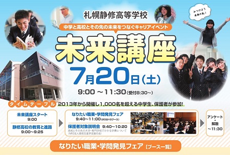 7月20日(土)9:00~11:30(受付は8:30~9:00)は、中学生・保護者対象の未来講座の日です。「なりたい職業・学問発見フェア」では、15の職業ブースと8の学問ブースが設置され、興味のある体験や説明を受けることができます。